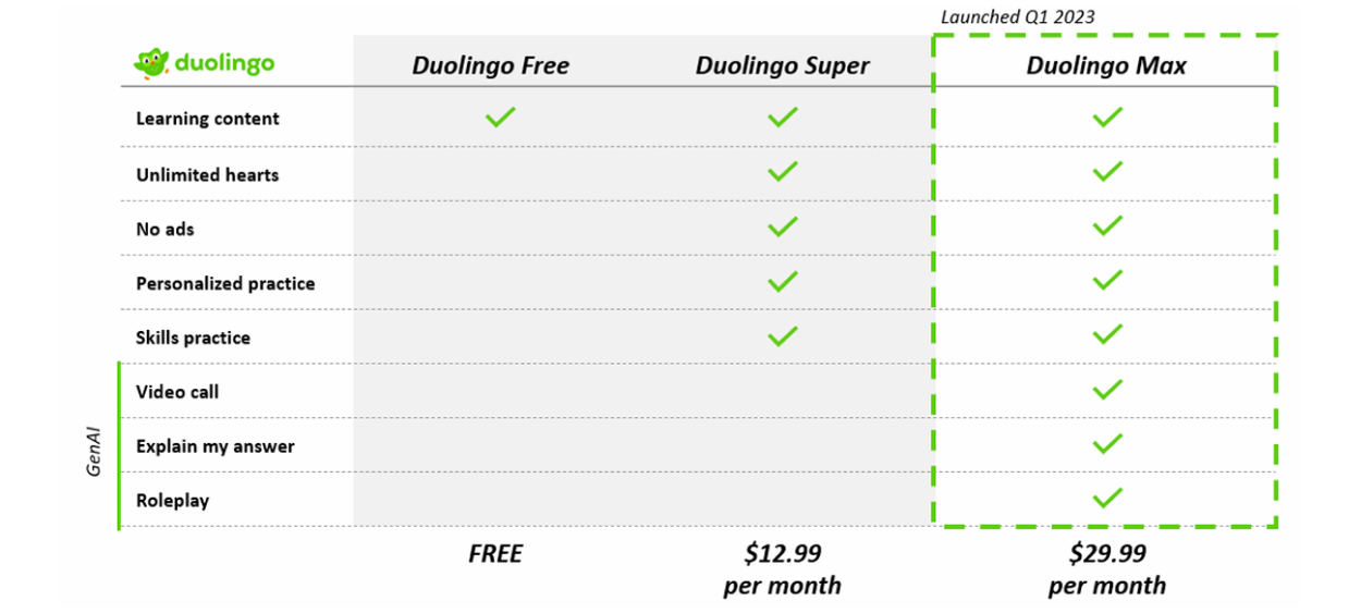 Prior to March 2023, Duolingo had two tiers: free (with ads) and paid (“Super”). These plans were available in single user and family plans, with a small set of one-time in-app purchases (e.g., $10 for reinstating your 652-day streak freeze). In March 2023, coinciding with the launch of GPT-4, Duolingo launched its new tier Duolingo Max (“Max”), which was primarily differentiated through features made possible through Gen-AI, including: